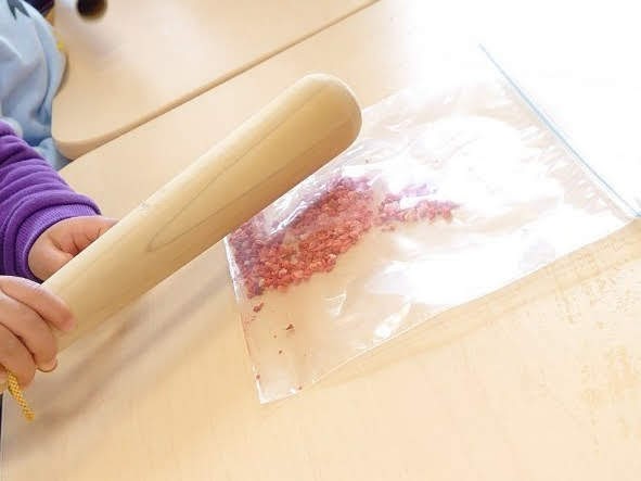 フリーズドライのイチゴを買ってきてチャック付きの袋に入れ、めん棒でたたいたり転がしたりして粉状につぶしてもらいました。小さい子にもできる単純作業ですが、どの子も興味津々。