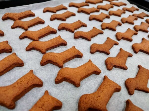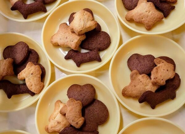 ↓こちらは、私が型抜きした犬型のクッキーです。(子どもたちが抜いてくれた分だけでは数が足りないため、給食室でも型抜きをしていました。)