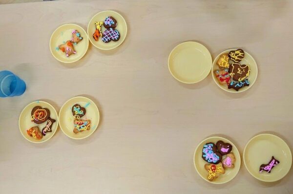 年中・年長はおやつ前の時間に、焼きあがったクッキーにアイシングをしました。今は、100円ショップでもアイシングペンというものが販売されています。(チョコペンではありませんが、使い方はチョコペンと同じです。)