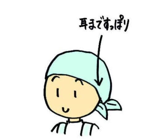 帽子や三角巾の外から髪の毛が見えないようにかぶることが理想です。
