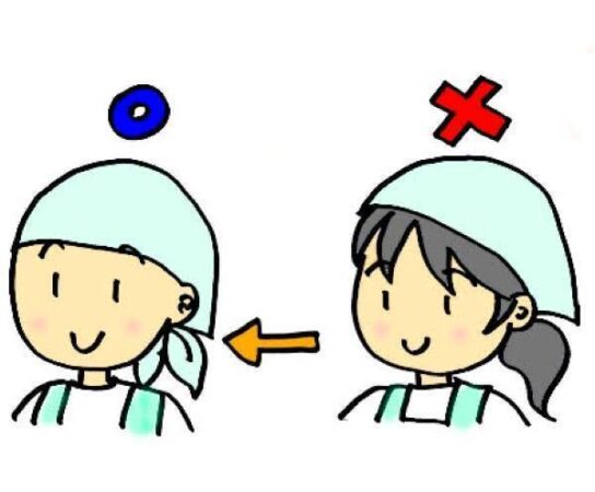 しかし、髪の毛が長い場合は帽子・三角巾に収まるようにまとめる必要があります。