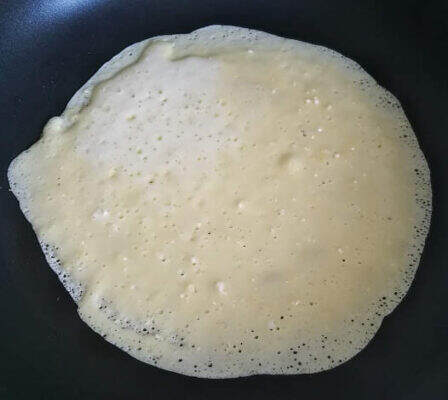 - 薄く油を引いたフライパンで薄焼き卵を作る要領で生地を焼きます。