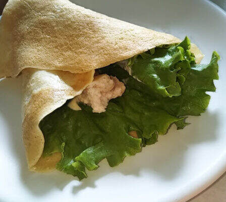 今回の生地には甘みがありませんので、サラダ巻きにもよく合いますし、生クリームを巻いても甘くなりすぎないと思います。生地の材料もたったの3つです。