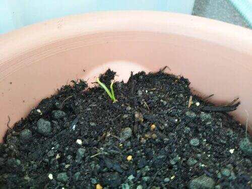土から顔を出しかけた状態でしたので、よく見ないと気が付かないくらいでした。数はたったの1つ。種はたくさんまいているので、このあとどのくらいの種から発芽するのか楽しみです。