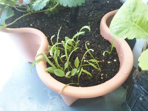 ある程度大きくなると、間引きをする必要が出てきます。最終的には株間は5cmほど空けることになります。もちろん間引かれた方のほうれん草もサラダとして食べることができるようです。
