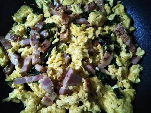 思ったよりはるかに少ない量になってしまったので、たまごとベーコンも一緒に炒めました。