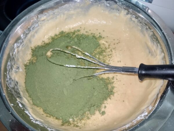 - 更に抹茶を入れて混ぜ、生地を完成させる。